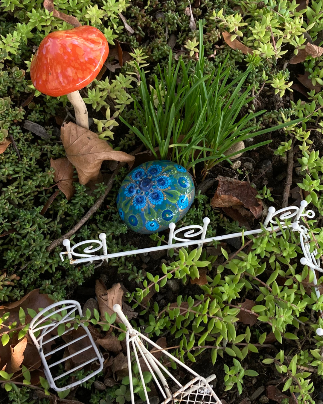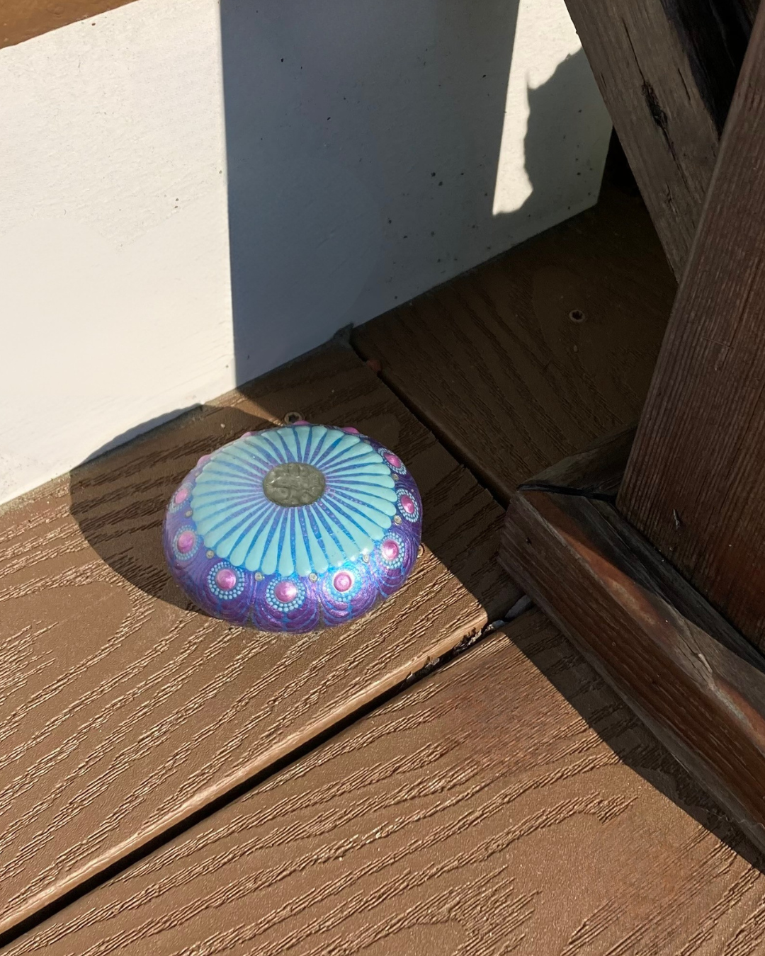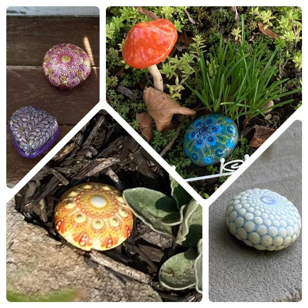 Fast forward to 2020, when the world was hit by the COVID-19 pandemic. Quarantine found me furloughed, with the need/opportunity to transform my considerable anxiety. Every day, I’d spend hours painting in my atelier and weeding in the garden, activities that helped me to cultivate a sense of calm. Soon, my atelier and garden were burgeoning with dot mandala rocks, which very much sparked of joy for me. Beyond my bubble, the numbers of people sick and dying with COVID skyrocketed. In order to stay healthy, we were no longer social or connected. When my son and I went out to do our “Couch to 5K” run, we would cross the street when we saw people, saying “hi” at a distance. The isolation felt profound. Taking a page from my public art experience in Philadelphia, I realized that I might be able to impact others through my art. I started littering my neighborhood with my dot mandala rocks. Next, I dropped off rocks in the gardens of members of my book club. Finally, I made sure that every time I went for a walk in my community, the path got “rocked”. My heart smiled when I made my anonymous “rock drops”, hoping that the rocks might bring a smile to other people in my community. And that was that. But it turns out that it wasn’t just that! I have been honored to hear a few stories that trickled back to me about how my neighborhood rock drops affected a few people. I’d like to share these stories with you.