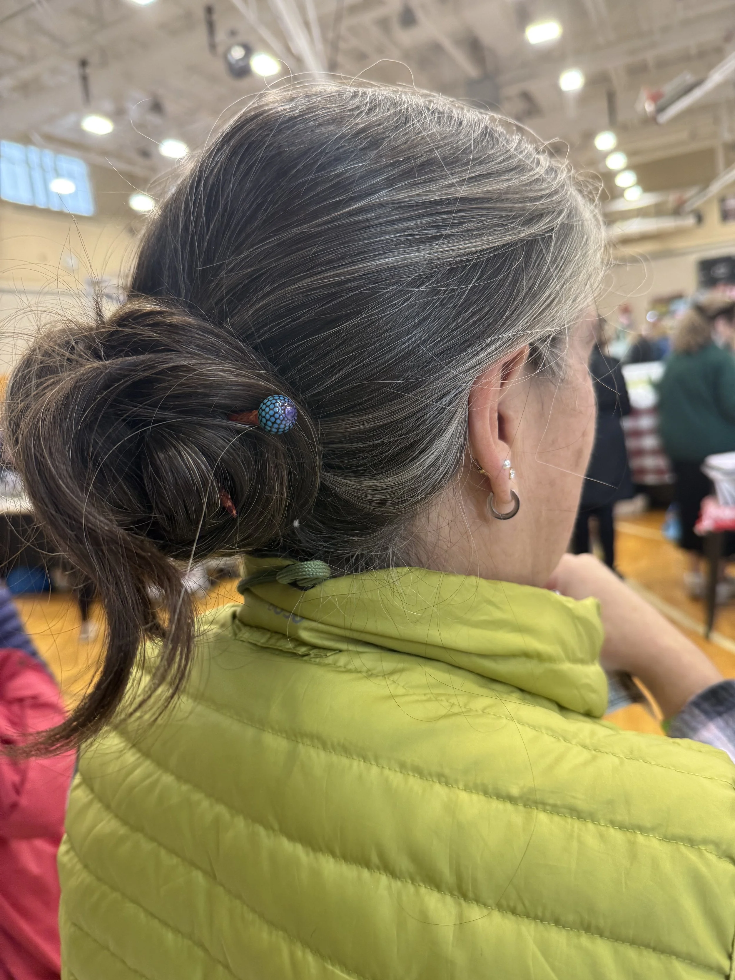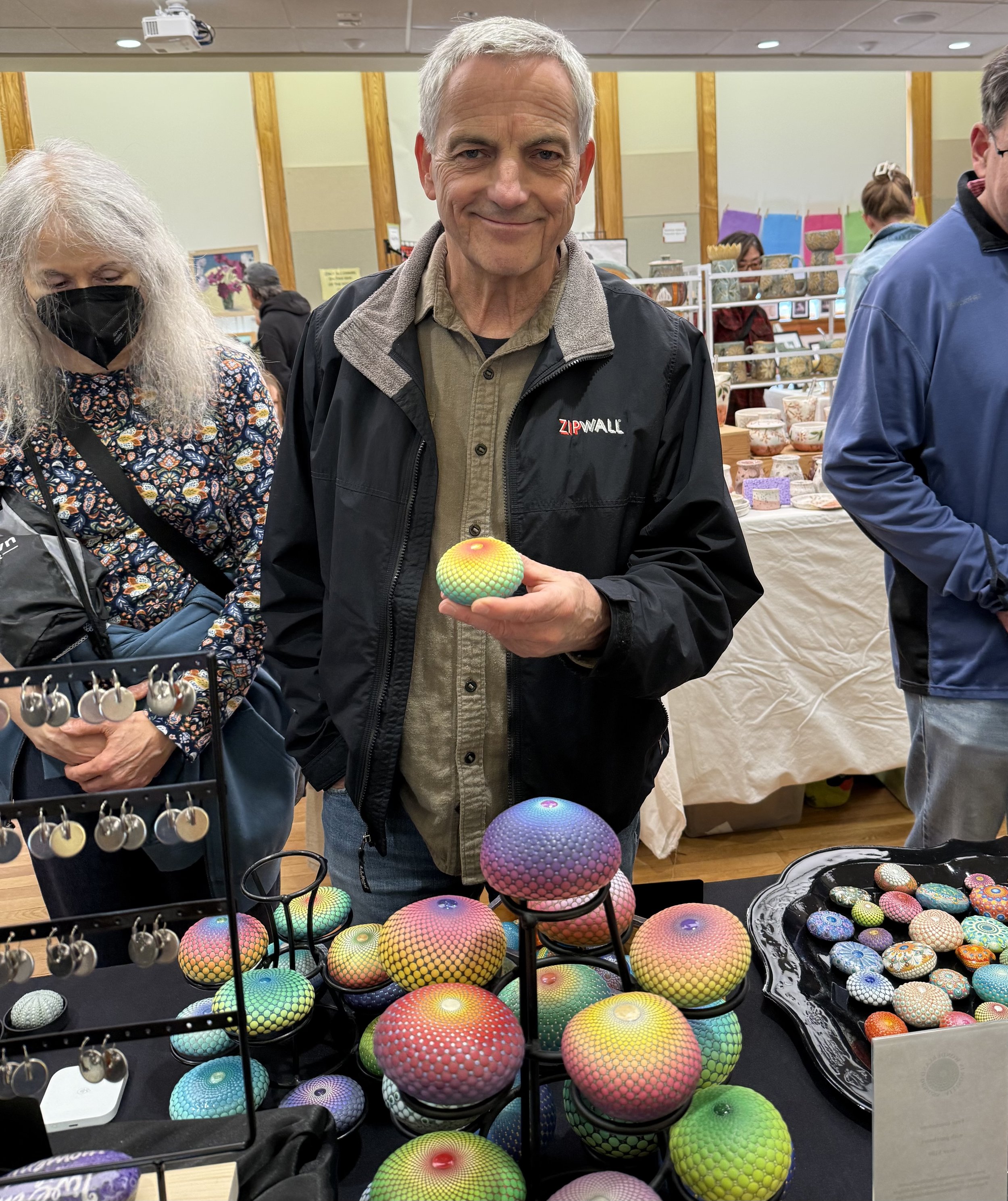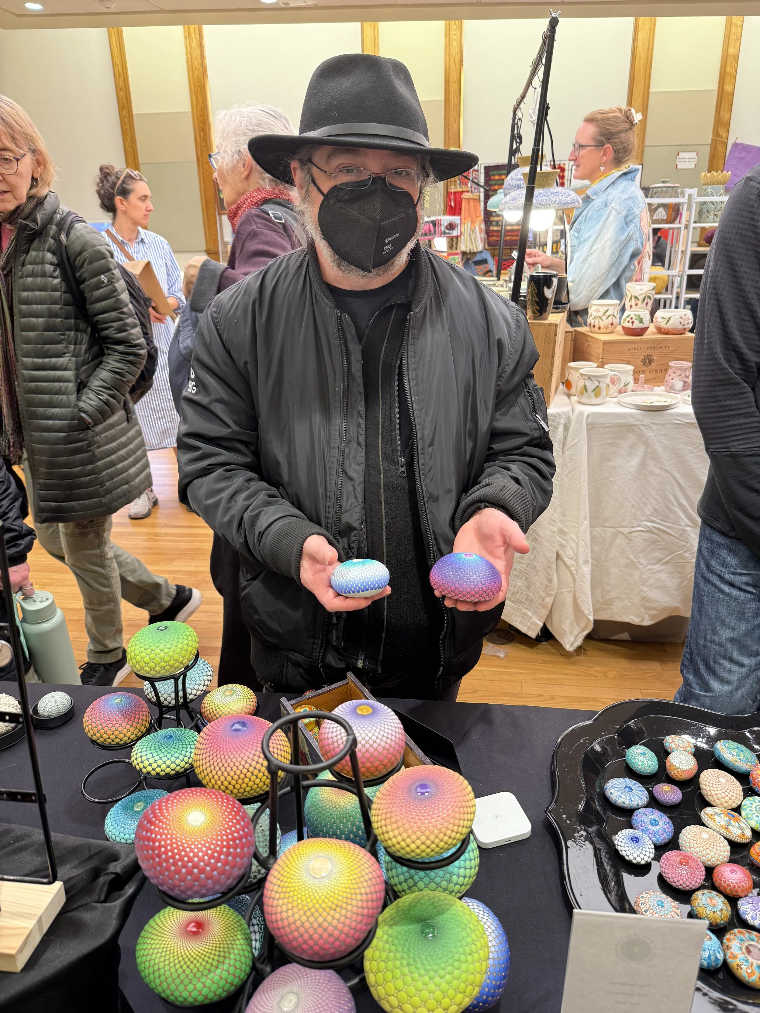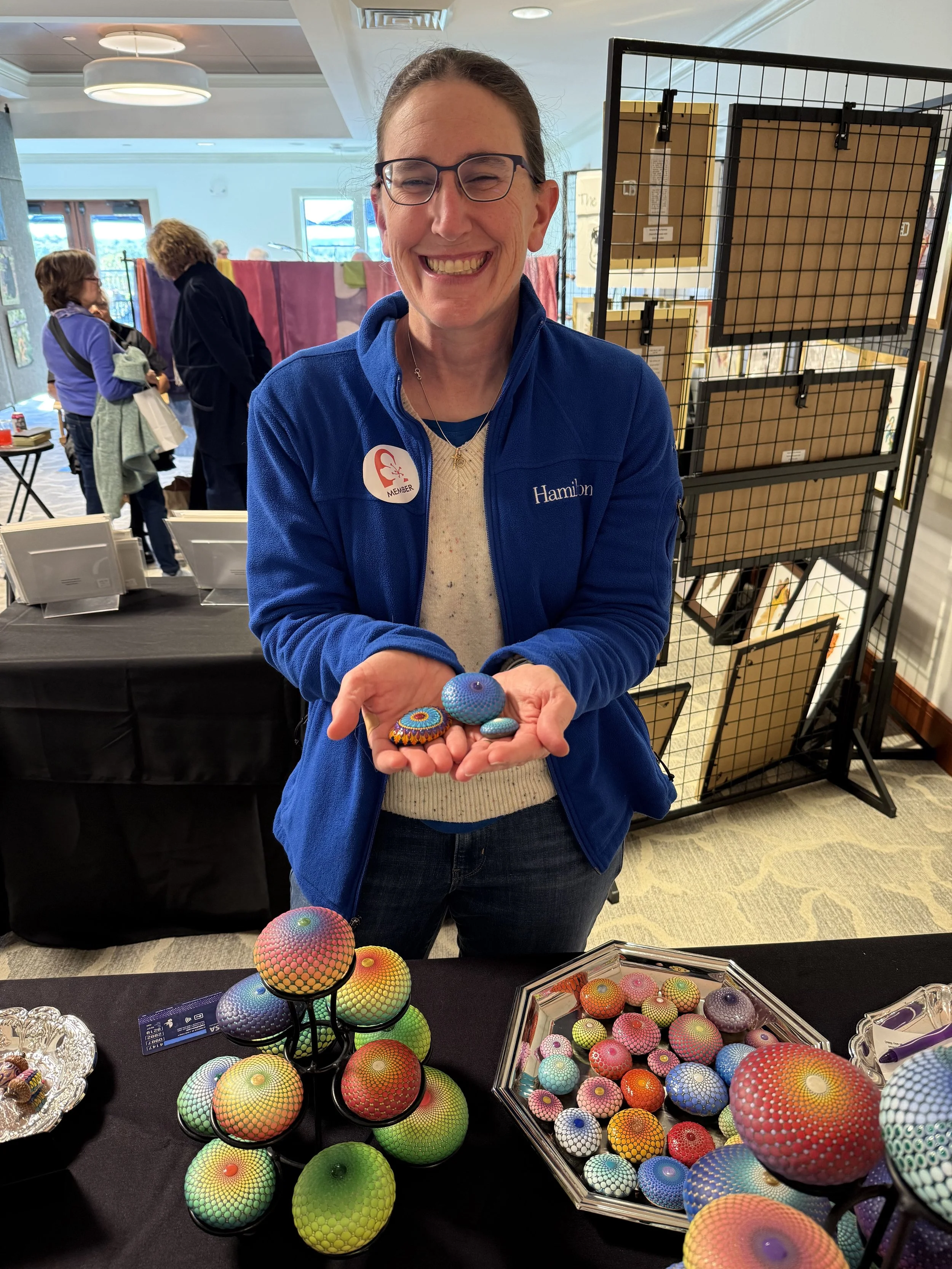 This man spent a lot of time at my table, contemplating my work. He decided to purchase a blue/silver stone that had many layers of varnish, embedding the dots like cloisonné. Love that he loved it!