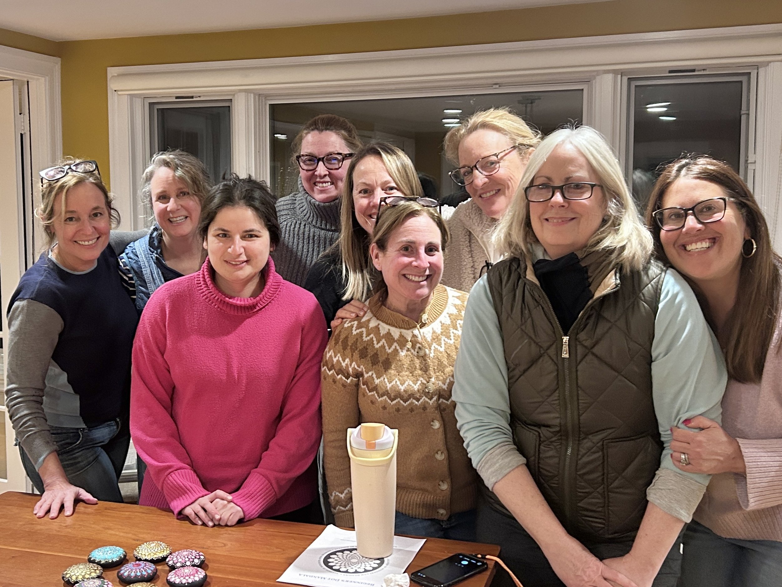 Before the event, I meet briefly with the host to choose a project. Options include: dot mandala stones, mugs, wine glass charms, magnet canvases, wine glasses, inspirational stones, small canvases, drawer pulls, flower pots, coasters, tea lights, ornaments, and more. Sessions are available in 2-hour or 4-hour formats, with all materials are provided. We bring everything to the venue of your choice, so your group can simply arrive, relax, and enjoy dotting together.